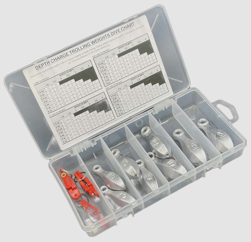 Depth charge clip on trolling weights are a simple, but effective way to add depth to any presentation. Using the simple 50/50 rule you can add an additional 7 feet of depth, to any presentation, for each ounce of weight used. Simply let out 50 feet of line clip on a weight and let of 50 feet more line. The combined effect of the spring tension and the rubber pads hold the weight firmly in place on your line while the center retaining pin adds extra assurance the weight will not fall off.